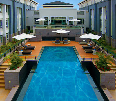 Lush gardens located next to the swimming pool