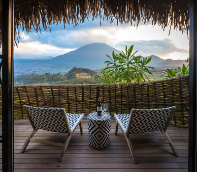 Wilderness Bisate enjoys dramatic views of Bisoke and Karisimbi volcanoes.