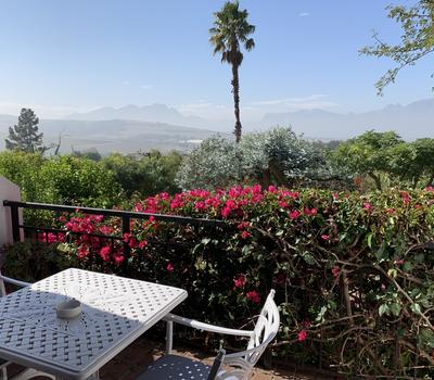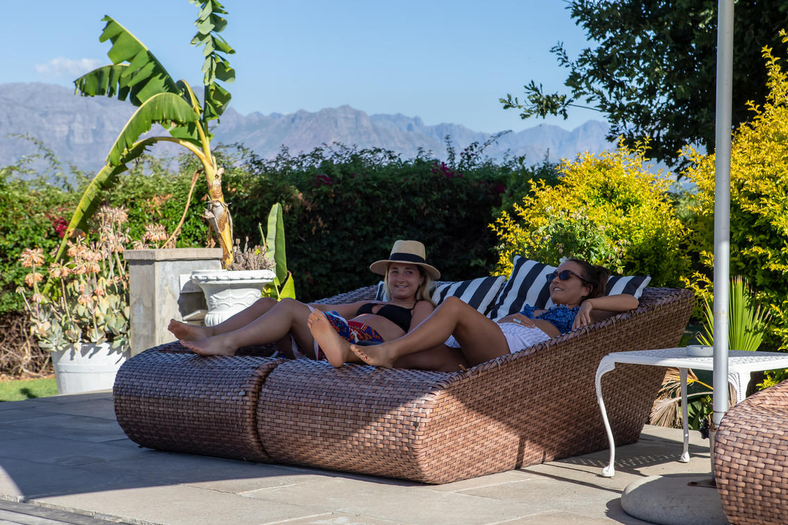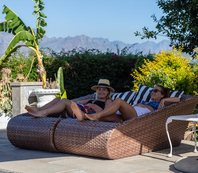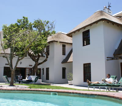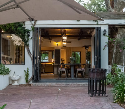 Back patio of Garden Family Suite and solar heated Lagoon Pool