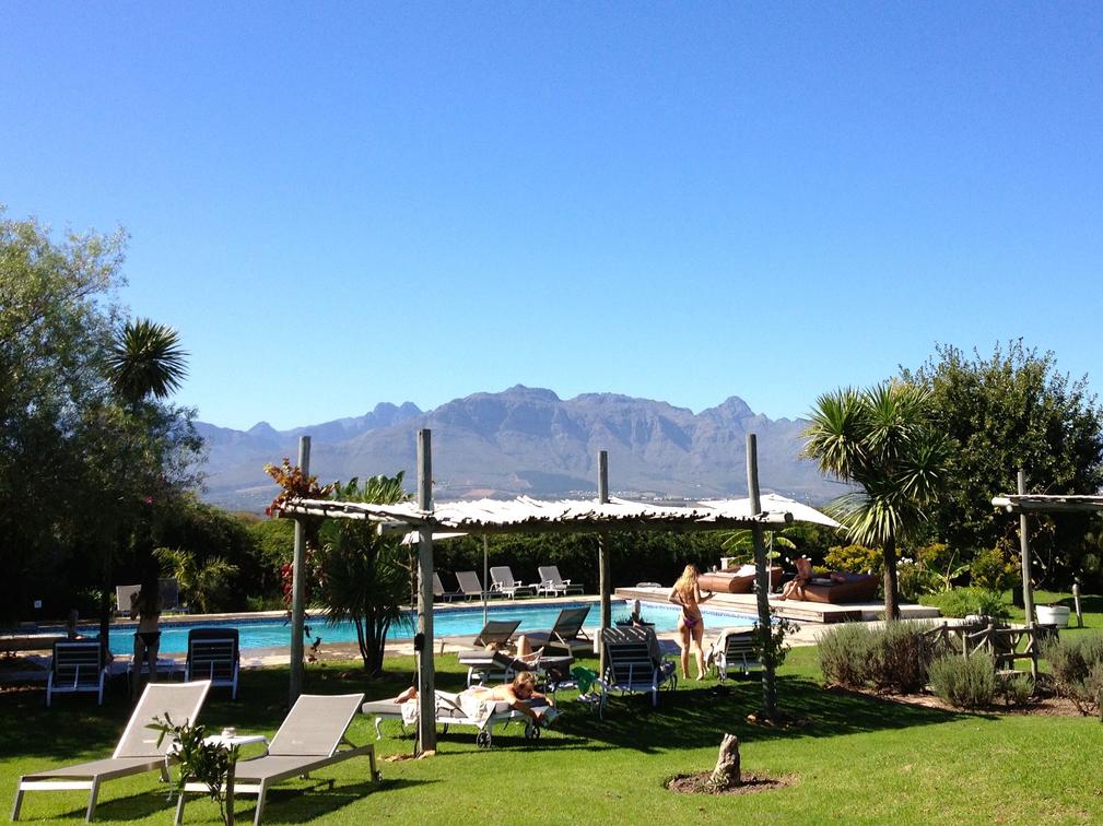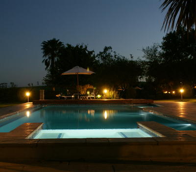 The lighting around the solar heated pool creates a lovely atmosphere in the evening