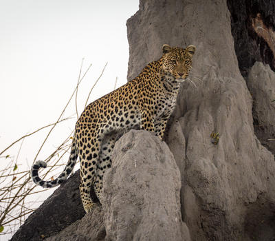Leopard making use of a termite mound's vantage point