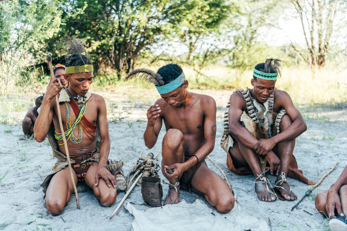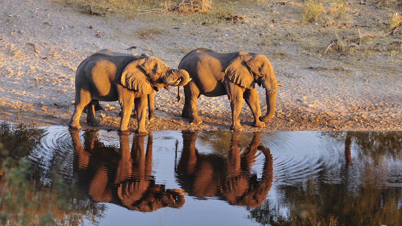 Fratelli che bevono un drink mattutino lungo il fiume Boteti vicino a Meno
